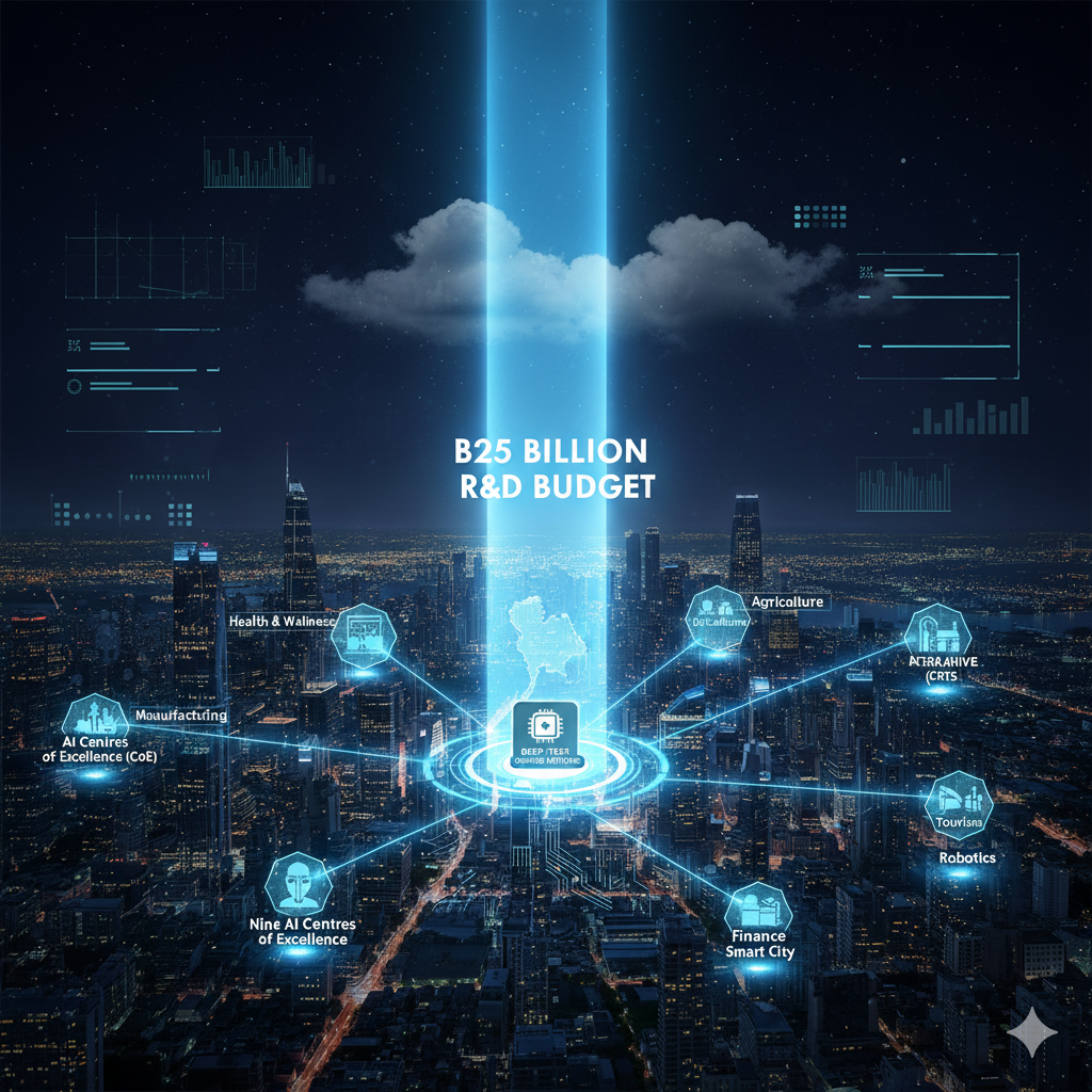 รัฐบาลไทยได้อนุมัติงบประมาณ 25,000 ล้านบาทสำหรับการพัฒนา AI และได้จัดตั้งศูนย์ความเป็นเลิศด้าน AI (AI Centres of Excellence – CoE) เก้าแห่ง 16 ซึ่งทำหน้าที่เป็นศูนย์กลางของความเชี่ยวชาญและนวัตกรรม 16