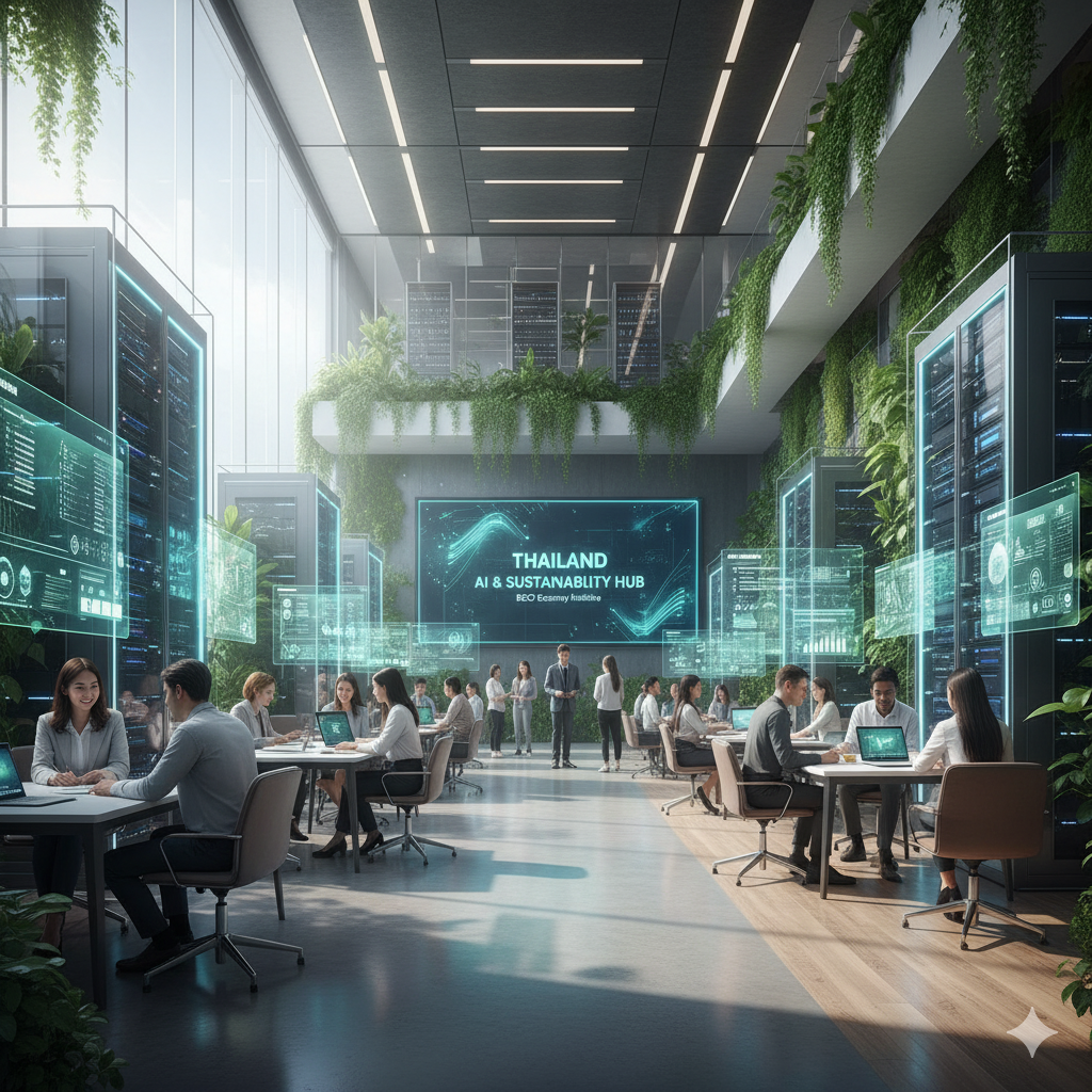 การพัฒนา AI ในประเทศไทยมีความเชื่อมโยงอย่างลึกซึ้งกับวาระด้านความยั่งยืน (Sustainability Agenda) ของประเทศ ยุทธศาสตร์ AI ถูกออกแบบมาให้สอดคล้องกับการพัฒนาเศรษฐกิจในรูปแบบ BCG Economy (Bioeconomy, Circular Economy, Green Economy) 5 การเชื่อมโยง AI เข้ากับ BCG และการสำรวจการใช้ Green Data Centers 7 แสดงให้เห็นว่าประเทศไทยมองว่า AI เป็นเครื่องมือในการบรรลุเป้าหมายการเติบโตอย่างยั่งยืน การดำเนินการนี้เป็นการสร้างความน่าสนใจให้กับนักลงทุนต่างชาติที่ให้ความสำคัญกับการลงทุนที่รับผิดชอบต่อสังคมและสิ่งแวดล้อม (ESG) และการนำ AI ไปใช้ในลักษณะที่มีความรับผิดชอบ.7